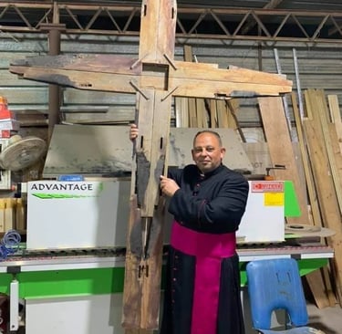 المطران ثابت يحمل الصليب الذي وُضِع في ساحة اللقاء مع البابا فرنسيس في الموصل